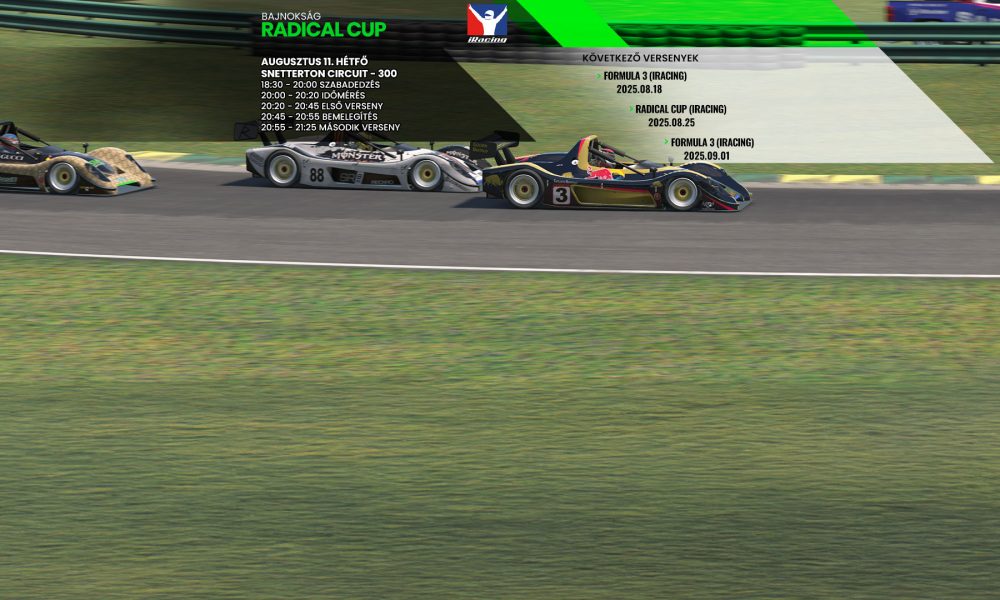 Folytatódik a Radical SR8 Cup, a ma esti helyszín az angol Snetterton pálya. A bajnokság negyedik fordulójához érkezünk el ma este. A bajnokságot három forduló hat...