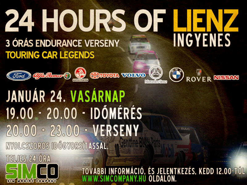 Vasárnap egy sorozatba kezdünk bele, melynek keretében több, ingyenes hosszú távú verseny bonyolítunk le. A mod a Touring Car Legends, mely nem túl gépigényes. A pálya az ISI által fejlesztett, kiemelked? min?ség? LIENZ 24 órás verziója. Ugyan a versenytáv „csak” 3 óra, az id?gyorsítás miatt egy teljes nap fog eltelni a pályán, így belebelaktatunk a hosszútávú versenyzés varázsába.