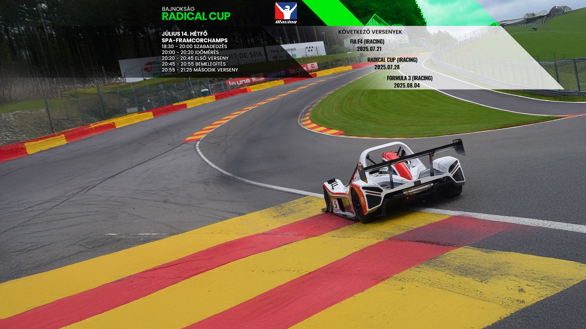 Az „A” hetes bajnokságunk folytatódik, ahol statikus az időjárás és nagyobb mértékben ingyenes tartalmakkal versenyzünk. A Radical SR8 Cup második fordulóját a Spa-Francorchamps pályán rendezzük.